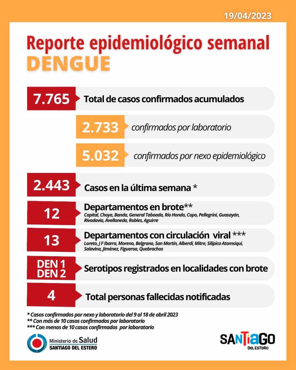 Según publicó la cartera sanitaria en sus redes sociales, de los 7.765 casos, 2.733 fueron confirmados por laboratorio y 5.032 por nexo epidemiológico. Esta semana 2.443 personas adquirieron la infección y ya son cuatro los muertos registrados oficialmente, informaron.