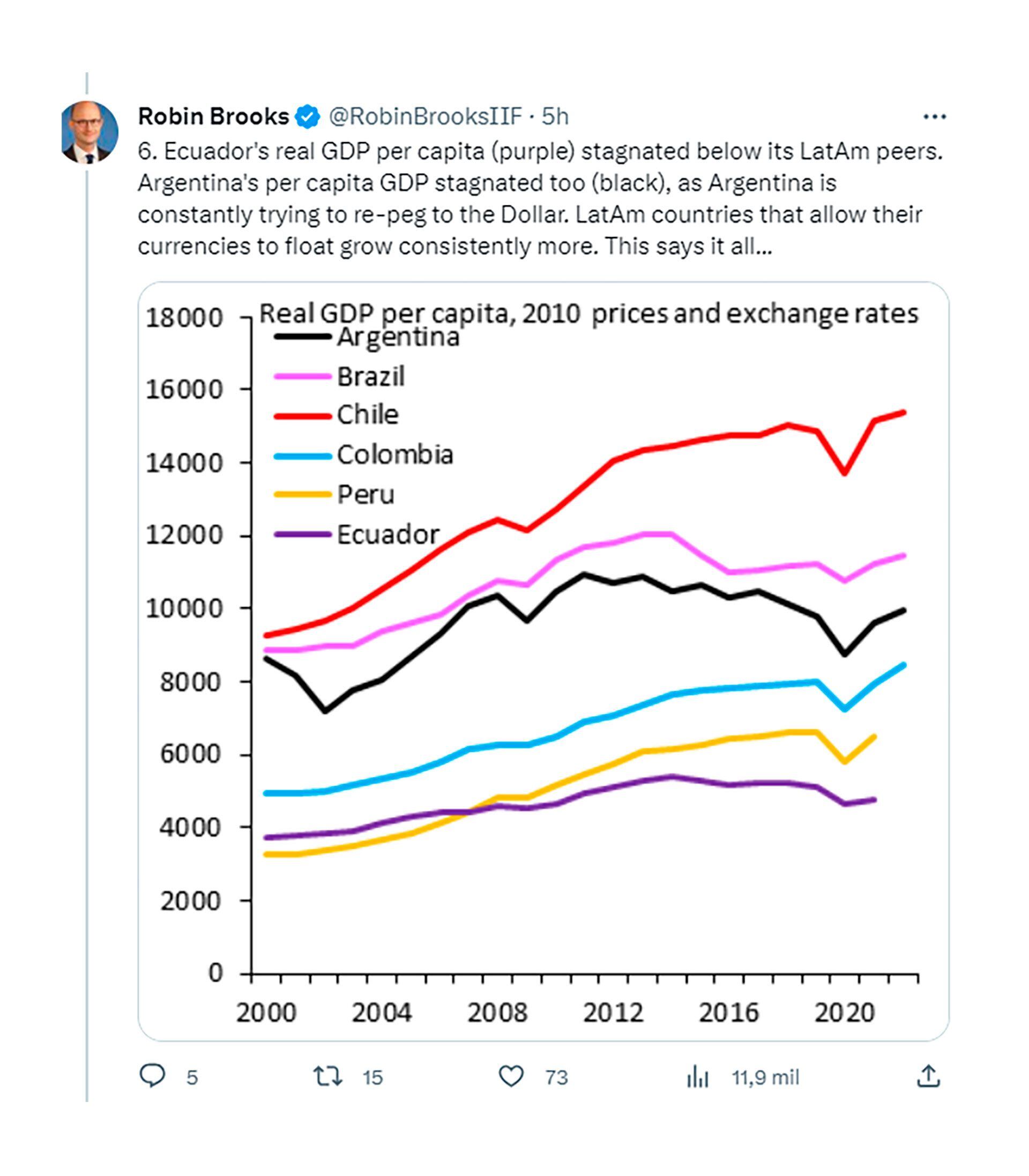 Según Brooks, la única razón por la que la Argentina tiene tipos de cambio paralelos es, precisamente, porque el valor de su moneda está vinculado al dólar en vez de ser determinado por el mercado. “La dolarización solo lleva este status al extremo y es exactamente la cosa equivocada que se puede hacer. Dejen flotar el peso y arreglen sus políticas”, concluyó.