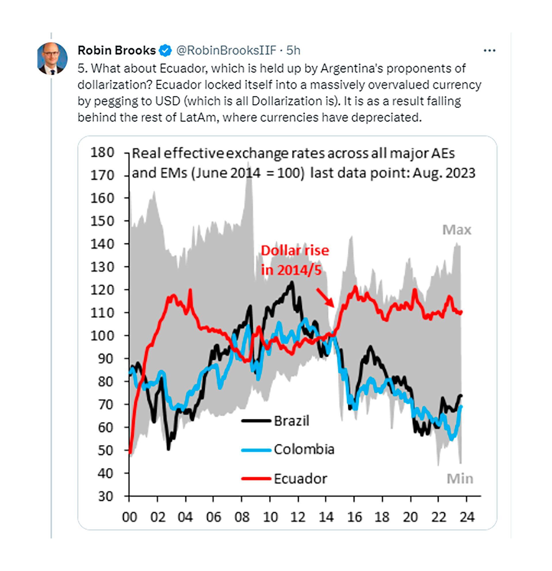 Brooks, quien ya había calificado a la dolarización como “una idea terrible; la última vez que se intentó esto terminó en una gran devaluación que lo descarta para siempre como un objetivo de política”, dijo que, incluso con la devaluación reciente, el peso (al tipo de cambio oficial) está “sustancialmente sobrevaluado, solo mire su nivel frente a Brasil y Turquía” y volvió este sábado a la carga, en un hilo de 7 posteos en X, como Elon Musk rebautizó a la ex Twitter.