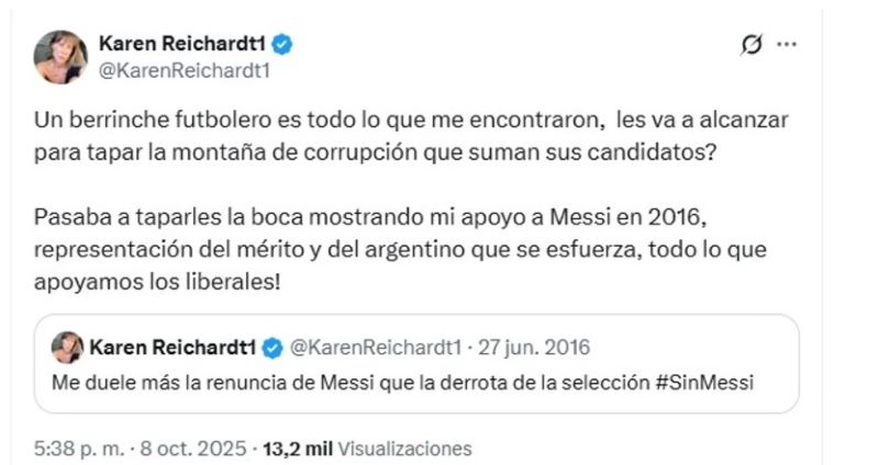 “Un berrinche futbolero es todo lo que me encontraron, les va a alcanzar para tapar la montaña de corrupción que suman sus candidatos?”, expresó Reichard en una publicación en la red social X, en donde se defendió por haber criticado a Messi.