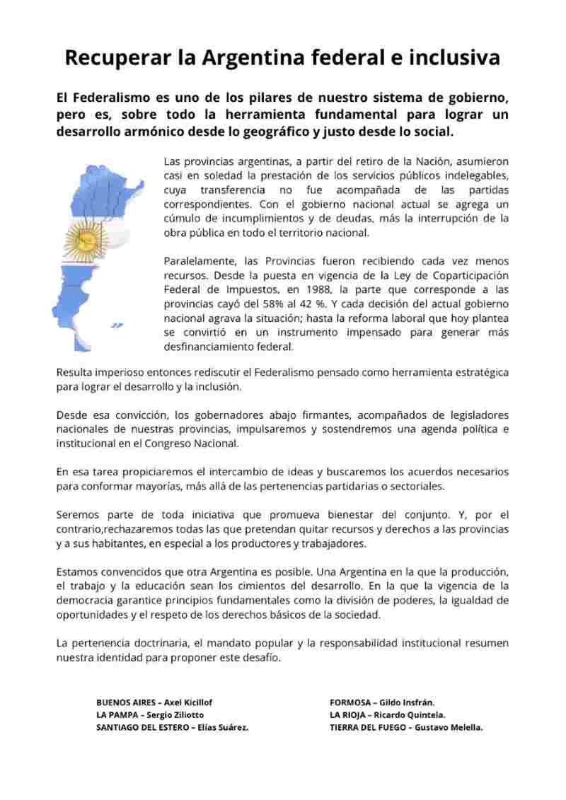 El texto, suscripto también por los gobernadores Axel Kicillof (Buenos Aires), Sergio Ziliotto (La Pampa), Gildo Insfrán (Formosa), Ricardo Quintela (La Rioja) y Gustavo Melella (Tierra del Fuego), plantea que el federalismo es uno de los pilares del sistema de gobierno argentino y una herramienta clave para lograr un desarrollo armónico desde lo geográfico y justo desde lo social. En ese sentido, advierte que, tras el retiro del Estado nacional de funciones esenciales, las provincias debieron asumir en soledad la prestación de servicios públicos indelegables, sin la correspondiente transferencia de recursos.