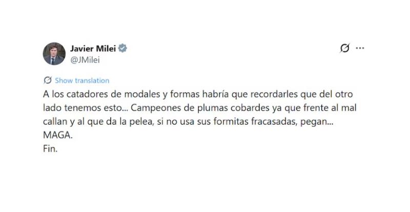 A través de las redes sociales, el presidente de la Nación emitió su opinión respecto a los graves incidentes que se registran en las afueras del Congreso de la Nación mientras puertas adentro del recinto se debate la reforma laboral. “Del otro lado tenemos esto”, señalo Javier Milei.