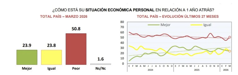 De manera coincidente, el relevamiento de Synopsis apuntó a que el 50,8 % de los encuestados consideró que su situación económica es peor que hace un año.