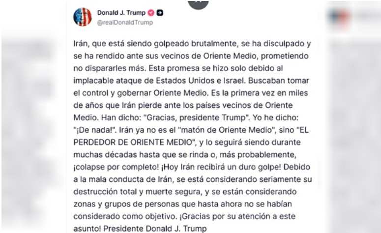 Para Trump, este gesto de diplomacia o repliegue por parte de las autoridades persas no representa otra cosa que una “rendición” ante la presión externa.