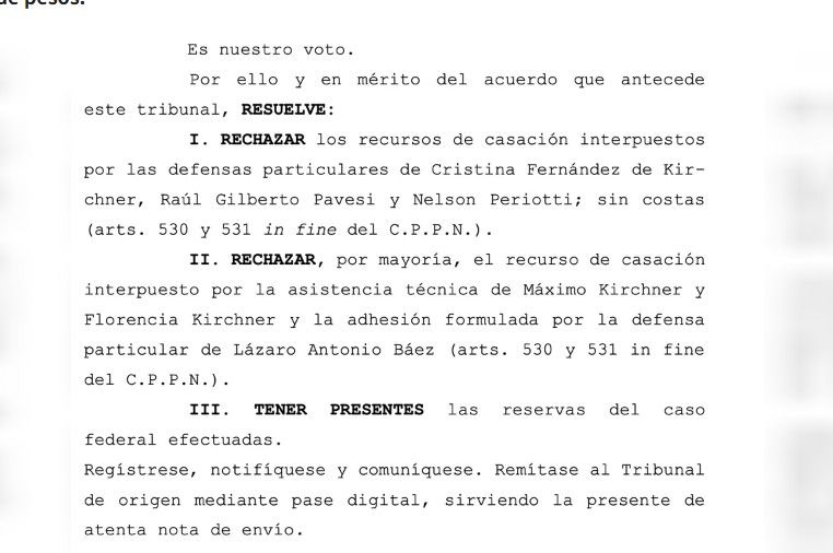“La esencia del decomiso es cumplir con el principio básico de justicia que impone, más allá de las condenas de carácter penal contra los responsables, nada más y nada menos que la restitución de los bienes que resulten del beneficio de un delito, en este caso, actos de corrupción”, sostuvieron desde la Cámara de Casación al dejar firme el decomiso de bienes en el marco de la causa Vialidad.
